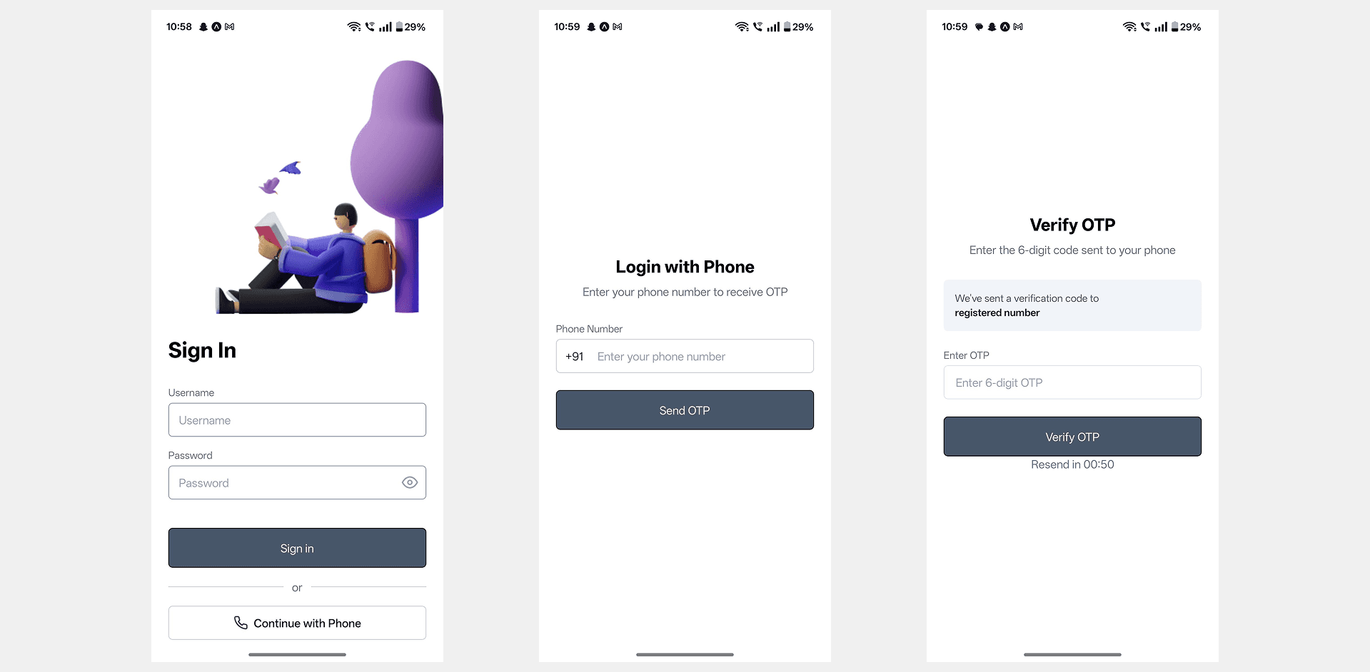 Secure and simple app login using mobile OTP. No password management — just a verified phone number.