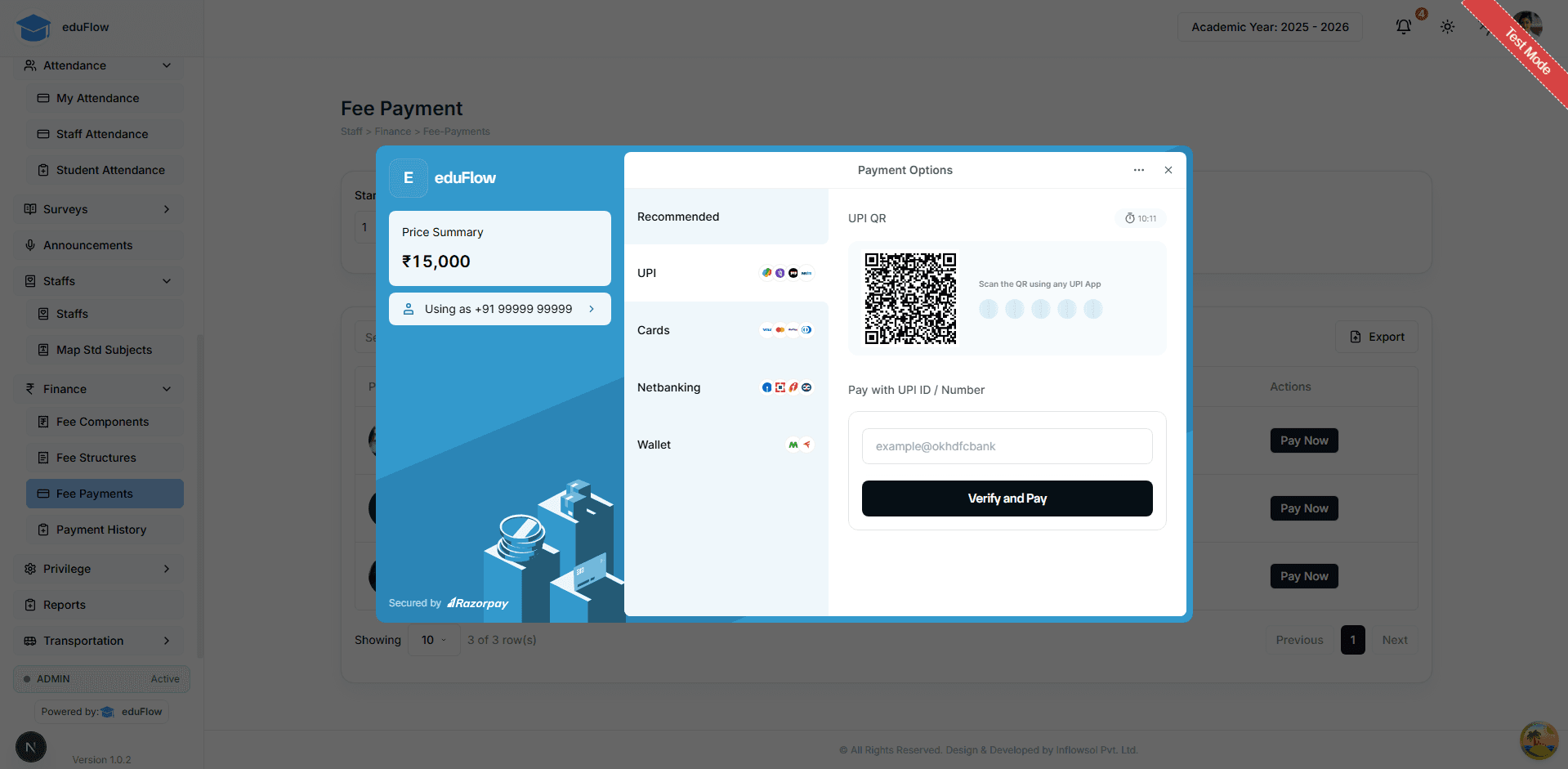 Quick, transparent, and secure school fee collection. Parents pay fees online via UPI or card through the Eduflow app.