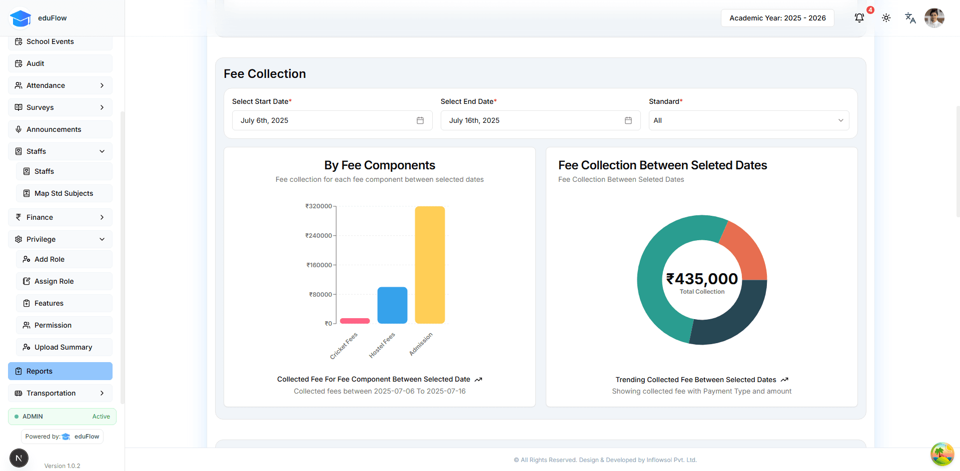 Track academic and admin performance in one dashboard. Graphical reports for attendance, fees, marks, and more.